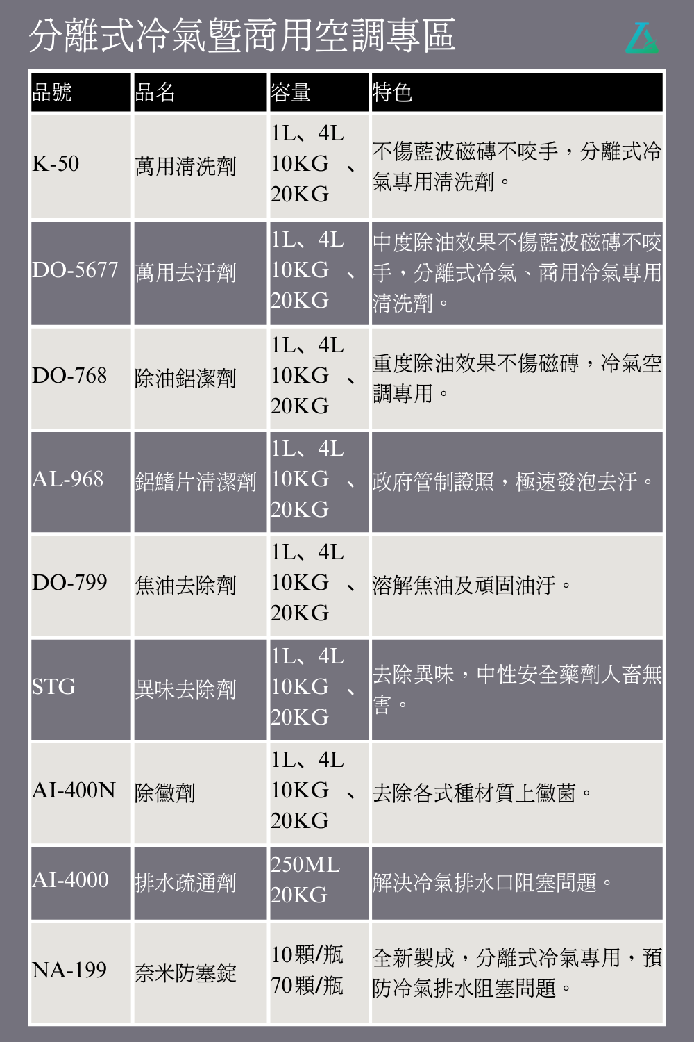 提供1L、4L、10KG、20KG 等多種包裝規格,滿足工程現場、保養合約與大量使用需求,為冷氣工程業者與清潔公司提升作業效率、降低維修風險。